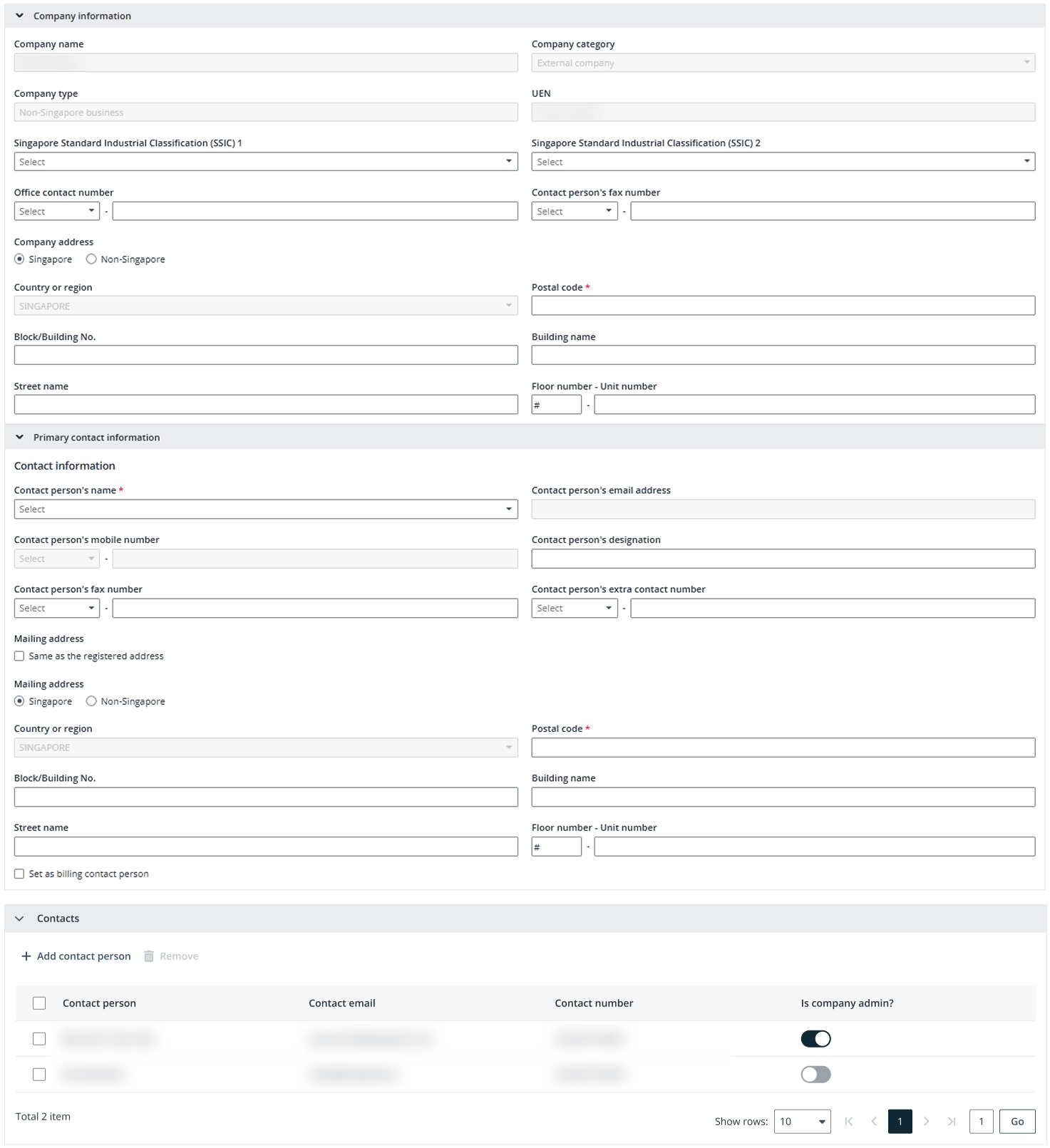 In the Contacts section, you can add company users who can access this portal. If the added user is a company admin who should have all access and permissions in this portal, turn on the toggle in the Is company admin? column.