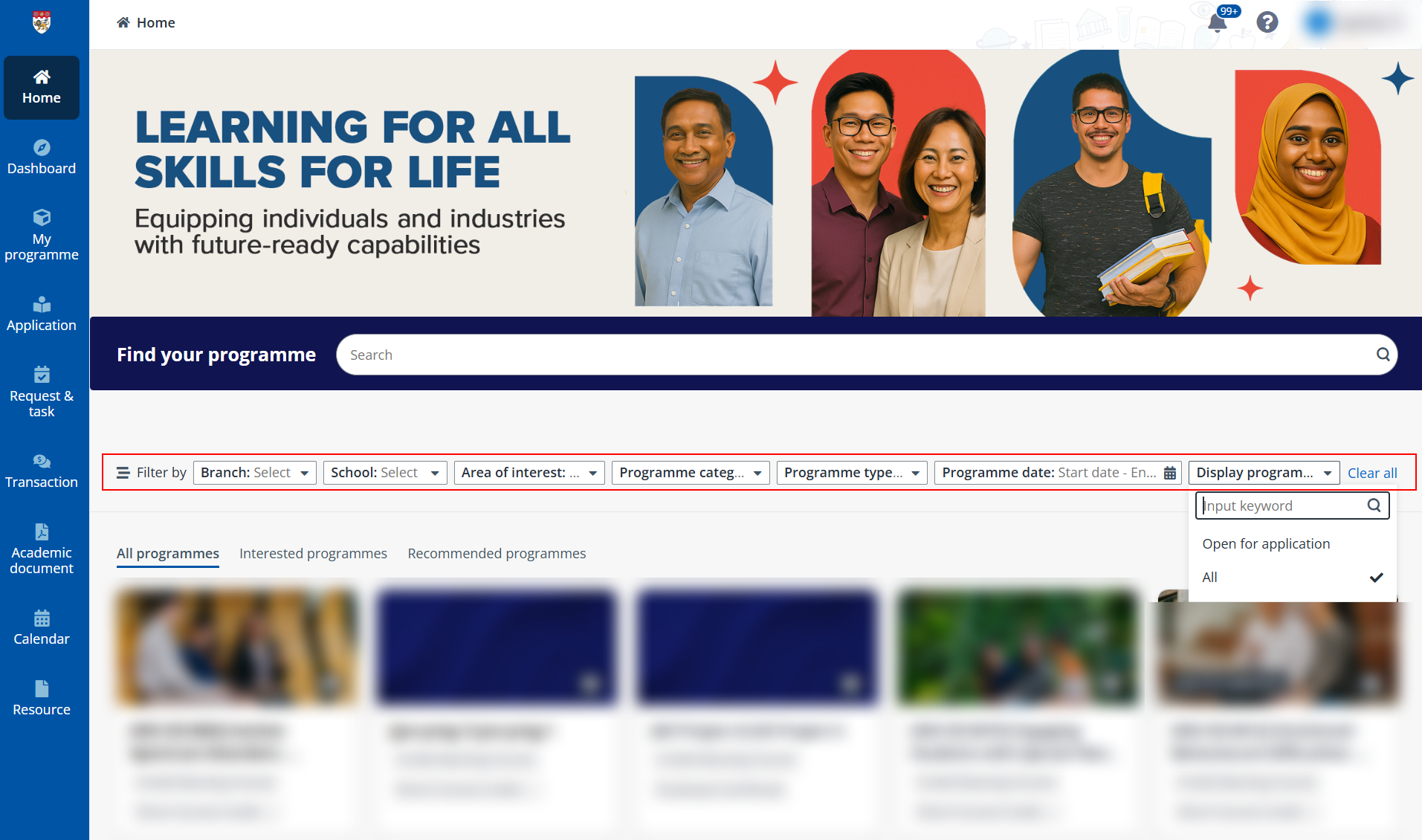 All programmes are listed on the Home page of the learner portal.