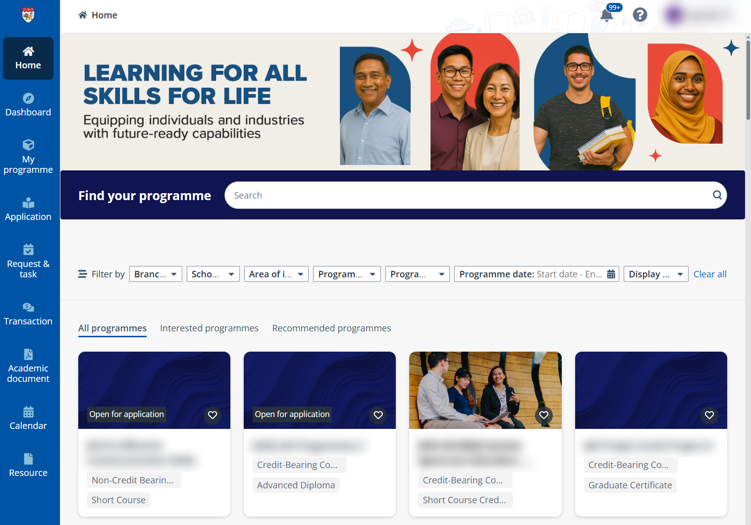 •Register interest – For programmes that you are interested in, you can also click the heart icon on the programme card to register your interest and receive notifications of the programme when it is open for application or when a new intake of this programme is open for application. The registered courses will be listed in the Interested programmes tab for your easier access.